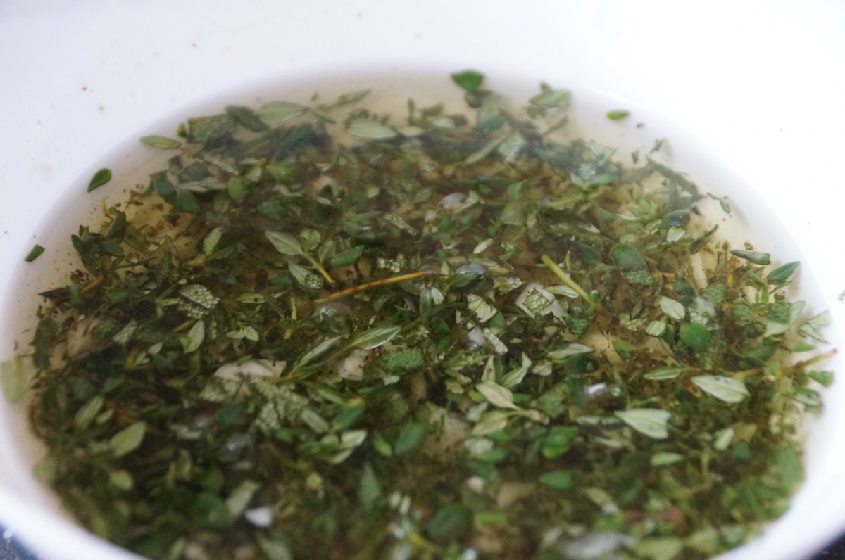 4. Maak een olie marinade: Doe 75 ml olijfolie in een schaaltje en breng op smaak met 4 tn knoflook, peper/zout, 4 blaadjes fijngesneden salie en de fijngesneden tijm