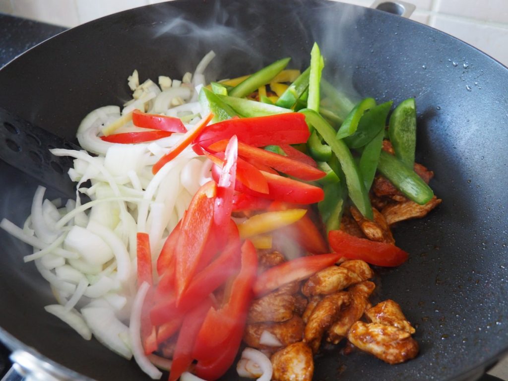 - Voeg de gesneden paprika’s, uien en knoflook toe en bak dit even kort mee. (de paprika en uien moet knapperig blijven)