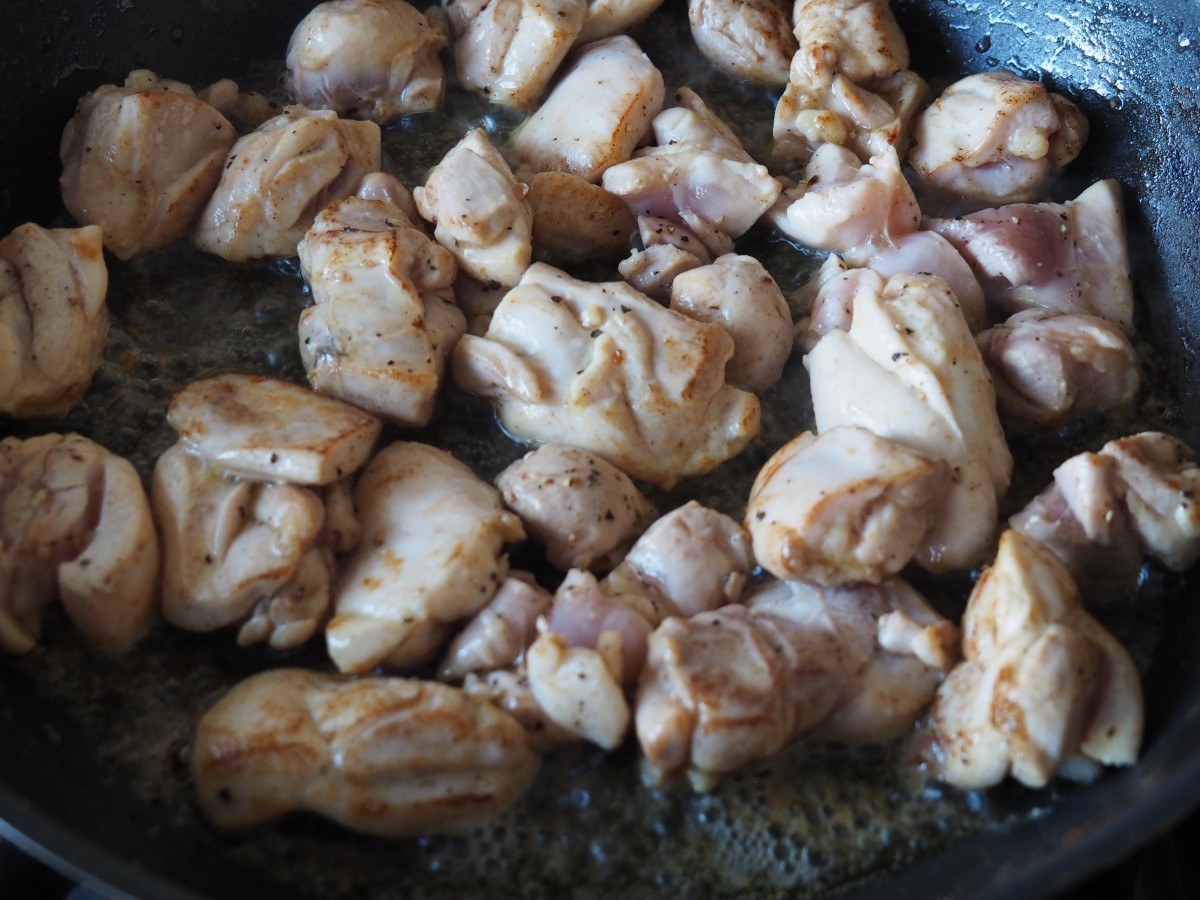 3 Verwarm een stoofpan op het vuur en leg hier de gebakken kippendijen in