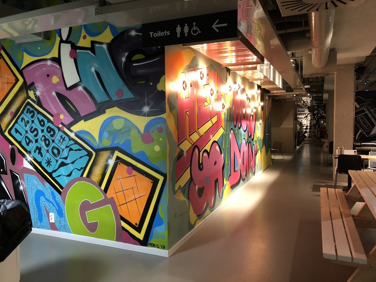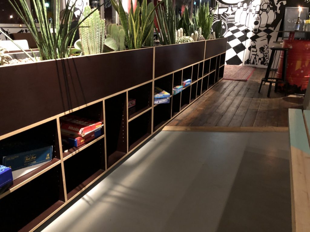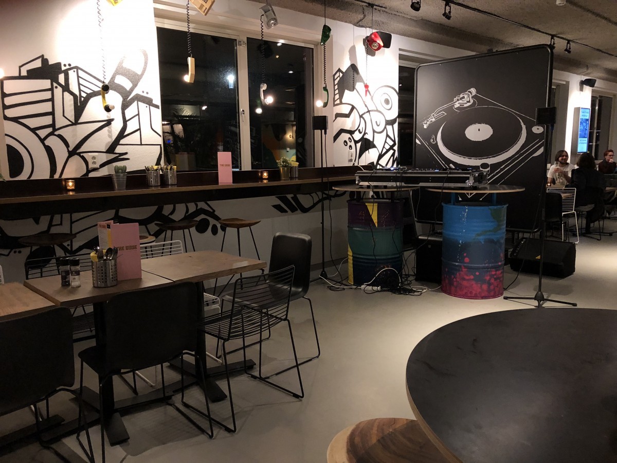 Toen wij aankwamen bleek bij de receptie dat er inderdaad weinig mensen van buitenaf komen. Wij werden aangesproken in het Engels, dit is de voertaal in heel het hostel, en ze dachten dat wij zouden komen slapen. Wij werden uiteindelijk meegenomen naar het restaurant. Ook nu weer wat verwarring bij ons, is dit wel onze plek? Het is heel urban en jong, niet echt een plek om met je kids te gaan eten. The Dude is een soort van overdekte picknickplaats met graffiti op de muren en een sobere inrichting. Zeker niet verkeerd hoor maar niet echt passend bij ons als doelgroep. Toch zagen we al wel snel een WII, een pooltafel en spelletjes die suggereren dat kinderen zeker wel welkom zijn. Kortom, veel tegenstrijdige signalen.