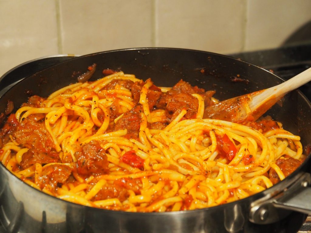 Voordat jullie denken dat ik betaald krijg voor dit artikel, ik krijg hier niet voor betaald en ook de ingrediënten hebben we gewoon zelf gekocht. Dit recept is eigenlijk een beetje uit nood geboren. Onze meiden vinden de gehaktballetjes van de Ikea altijd super lekker en daarom hadden wij een keer een zak diepvries gehaktballen meegenomen om thuis te kunnen opwarmen voor ze. Nu kregen wij onverwacht visite wat wilde blijven mee eten en we hadden amper iets in huis, dit gebeurd ons bijna nooit maar nu dus wel. Wat we wel in huis hadden, waren tomatenblokjes, de Zweedse gehaktballetjes, wat gedroogde kruiden, uien, knoflook en pasta. Hiermee ben ik aan de slag gegaan en voilà een super lekkere pasta was geboren. Deze pasta viel bij iedereen zo in de smaak, dat we de pasta nog net niet wekelijks klaarmaken. Het is een ideaal recept om te maken na een lange werkdag, want hij is echt in 10 minuten gepiept. Nu vinden wij hem het lekkerst als de saus een half uurtje mag pruttelen maar dit is niet perse nodig.