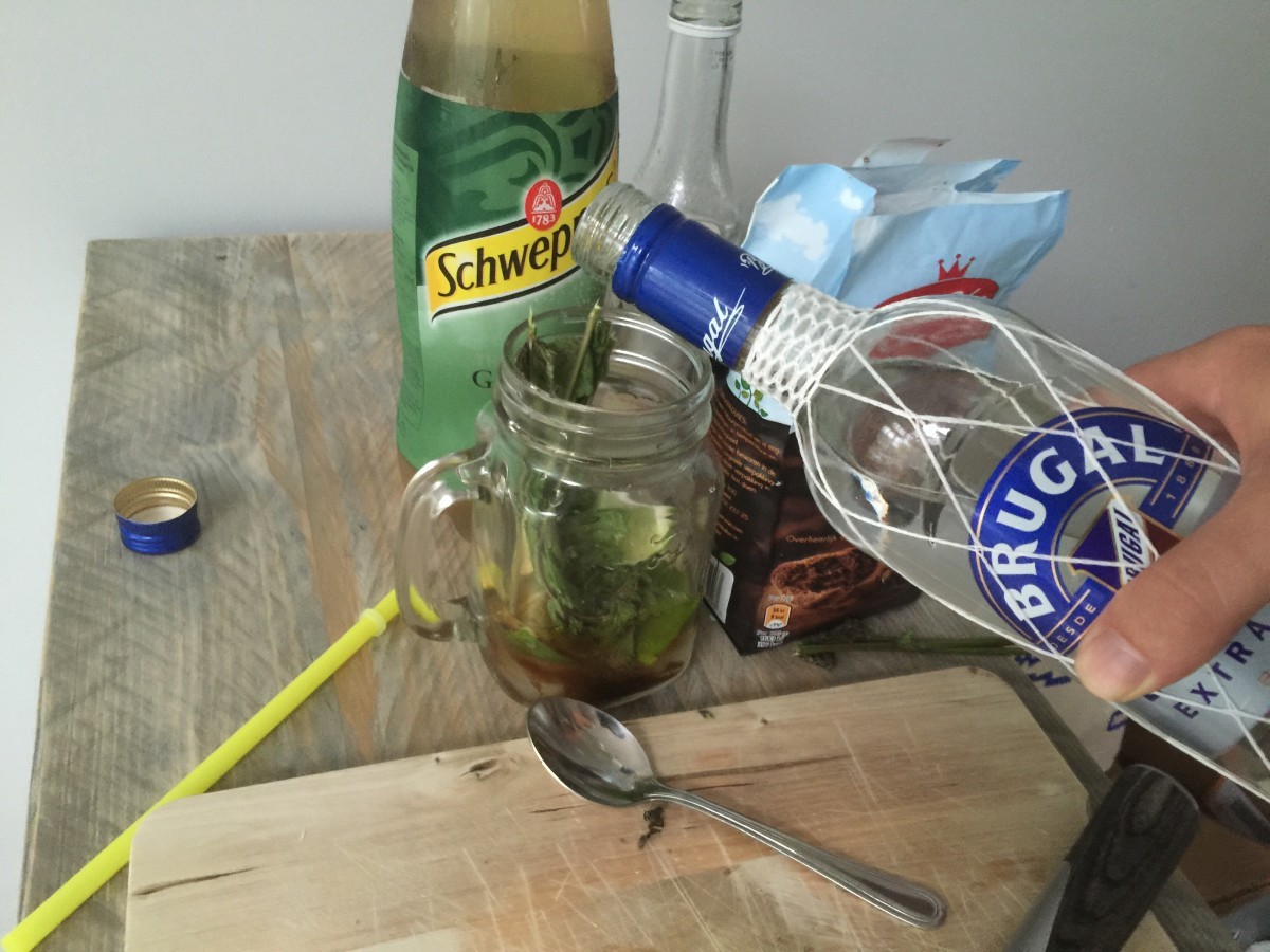 -Schep een flinke theelepel basterdsuiker in de jar. De basterdsuiker geeft een lekker knispertje en een mooie kleur aan de cocktail